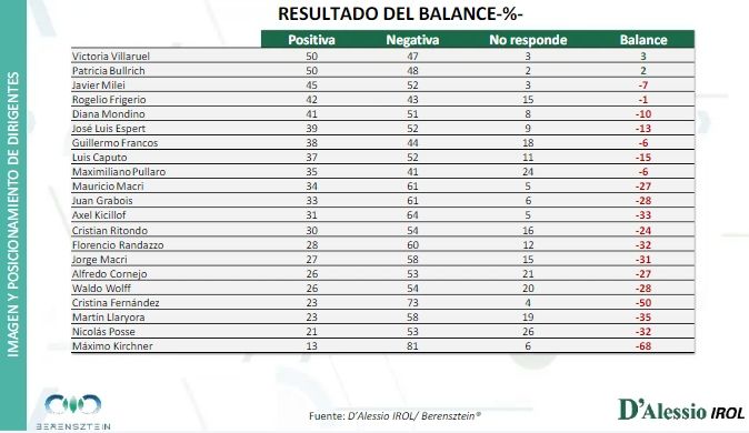 La encuesta también indica que las figuras con mejor imagen son la vicepresidenta, Victoria Villarruel, y la ministra de Seguridad de la Nación, Patricia Bullrich. Ambas, con un 50%, seguidas por el presidente Javier Milei con 45%.