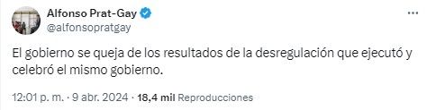En tono burlón, el exfuncionario durante el Gobierno de Mauricio Macri escribió en su cuenta de la red social X: "El Gobierno se queja de los resultados de la desregulación que ejecutó y celebró el mismo Gobierno".