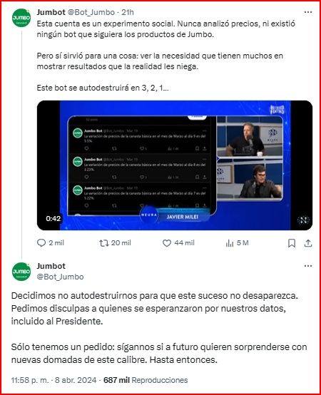 Cuando tanto el presidente como el ministro de Economía citaron los datos del Jumbo Bot (nombre de la cuenta), el usuario detrás de la misma escribió que en realidad se trataban de números falsos: "Esta cuenta es un experimento social. Nunca analizó precios, ni existió ningún bot que siguiera los productos de Jumbo. Pero sí sirvió para una cosa: ver la necesidad que tienen muchos en mostrar resultados que la realidad les niega".