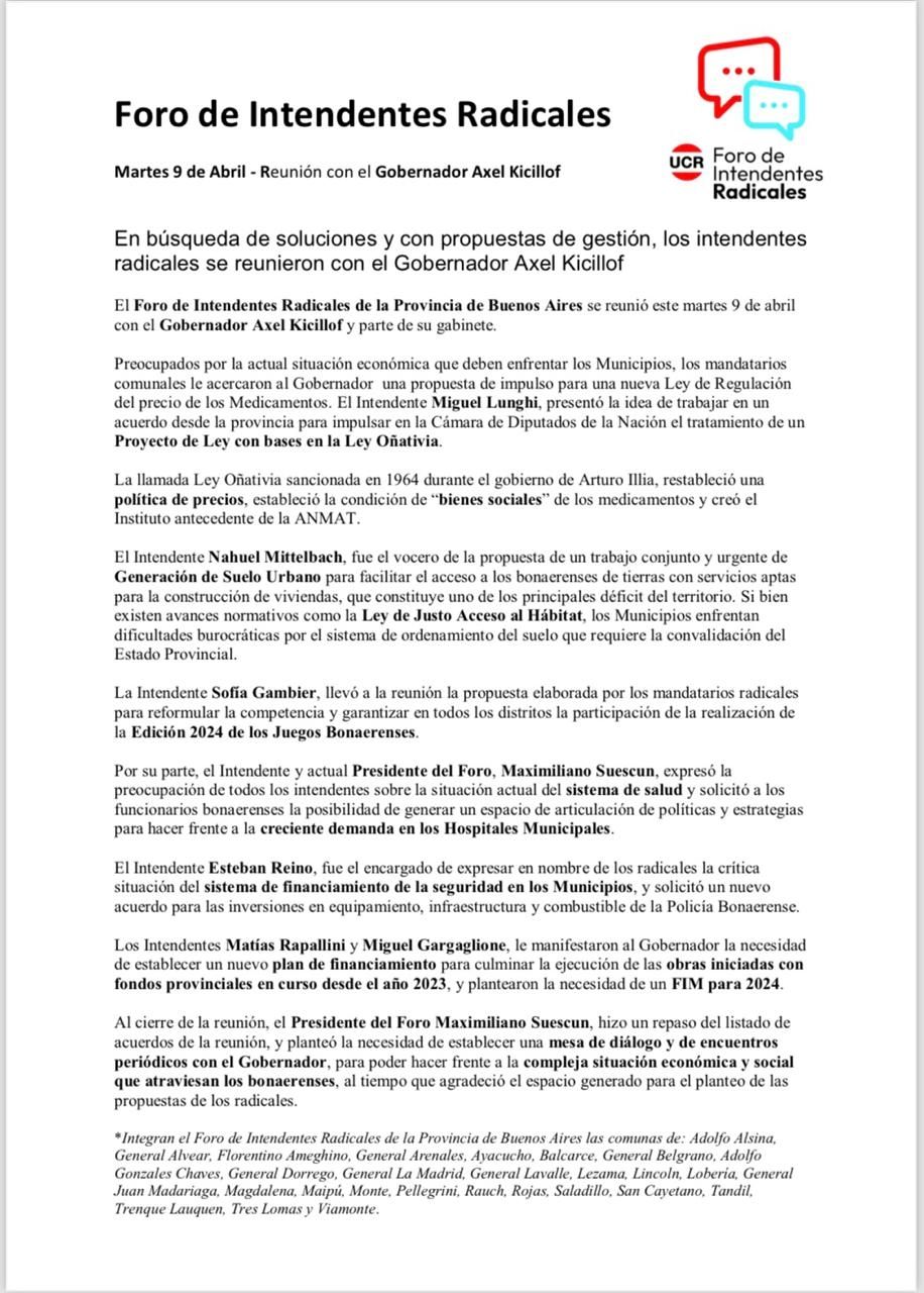 Con asistencia casi perfecta - faltaron 2 de los 26- el Foro de intendentes radicales le llevó al gobernador Axel Kicillof y a sus ministros, un eje de temas acordados por los jefes comunales boina blancas en el cónclave de la localidad bonaerense de González Chávez.