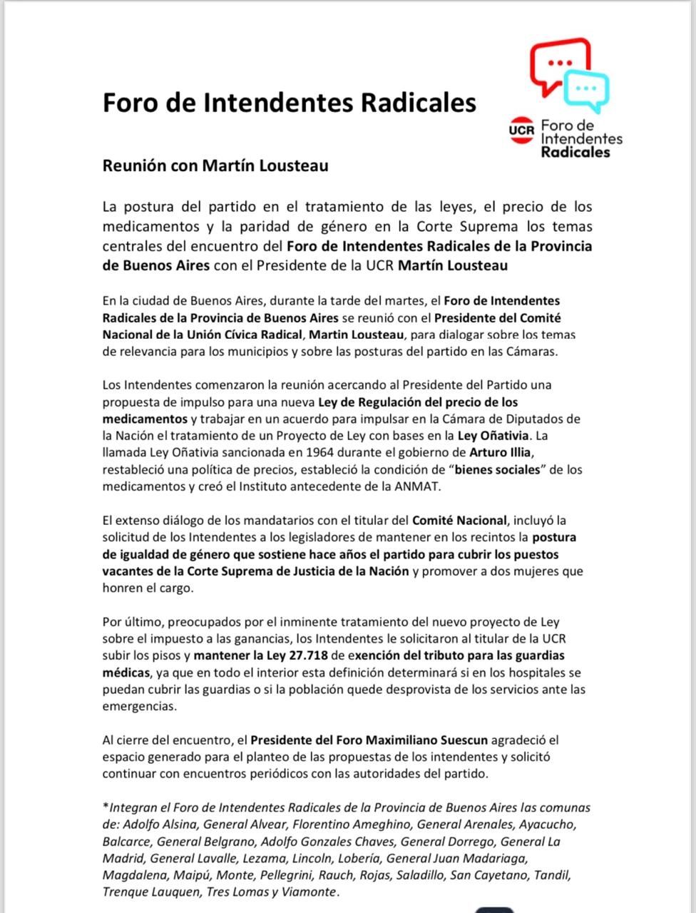 Tras el encuentro con el gobernador de la provincia de Buenos Aires Axel Kicillof y sus ministros, el foro de intendentes radicales bonaerenses se reunió con el Senador Nacional y Presidente del Comité Nacional de la UCR, Martín Lousteau, a quien le acercaron la propuesta de una nueva Ley de regulación del precio de los medicamentos y trabajar en un acuerdo, con la provincia de Buenos Aires, para impulsar en el Congreso de la Nación el tratamiento del Proyecto con bases en la Ley Oñativia, anteriormente expuesta en la reunión con Kicillof.