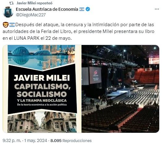 Tras bajarse de la Feria del Libro, el presidente de la Nación Javier Milei ya eligió el reemplazo del lugar para presentar su libro: será en el Luna Park, el próximo 22 de mayo.