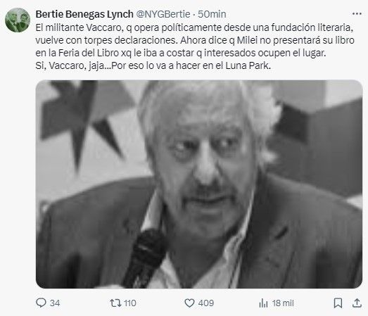 “El militante Vaccaro, que opera políticamente desde una fundación literaria, vuelve con torpes declaraciones. Ahora dice que Milei no presentará su libro en la Feria del Libro porque le iba a costar que interesados ocupen el lugar. Sí, Vaccaro, jaja. Por eso lo va a hacer en el Luna Park”, escribió en la red social X.