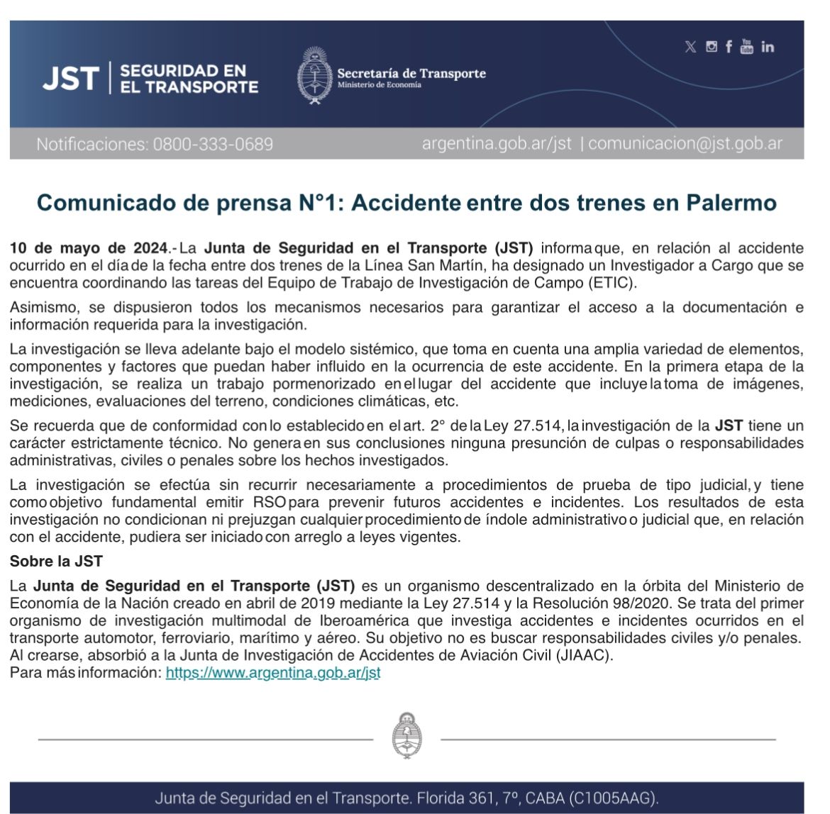 Por su parte, sostuvo que desde la administración libertaria intentan ser prudentes y poner a disposición de la justicia la tarea de la investigación que lleva la empresa Trenes Argentinos y el personal de la Comisión Nacional de Regulación del Transporte (CNRT).