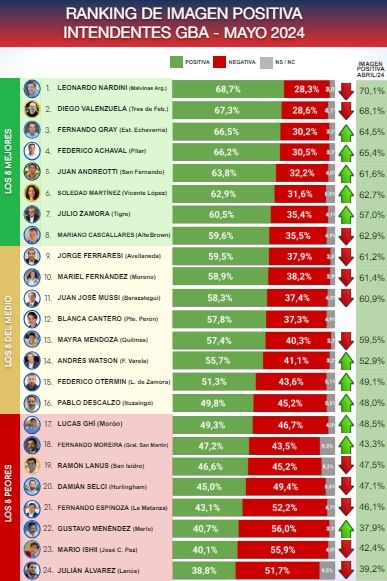 En el podio, Nardini -del kirchnerismo- se consolida como el mejor posicionado con 68,7% de imagen positiva, aunque con una caída de -1,4% en relación a la última medición. En tanto que Valenzuela -del PRO- cosechó 67,3%, con una variación en su contra de -0,4%. Gray -del peronismo no camporista- 66,5% con una subida de de 2% en comparación a abril.