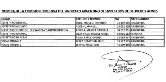 La nota que compartió el portal señalaba -adjuntando documentación- que Adorni había firmado para pedir la constitución de un nuevo gremio denominado Sindicato Argentino de Empleados de Delivery y Afines (SAEDA).