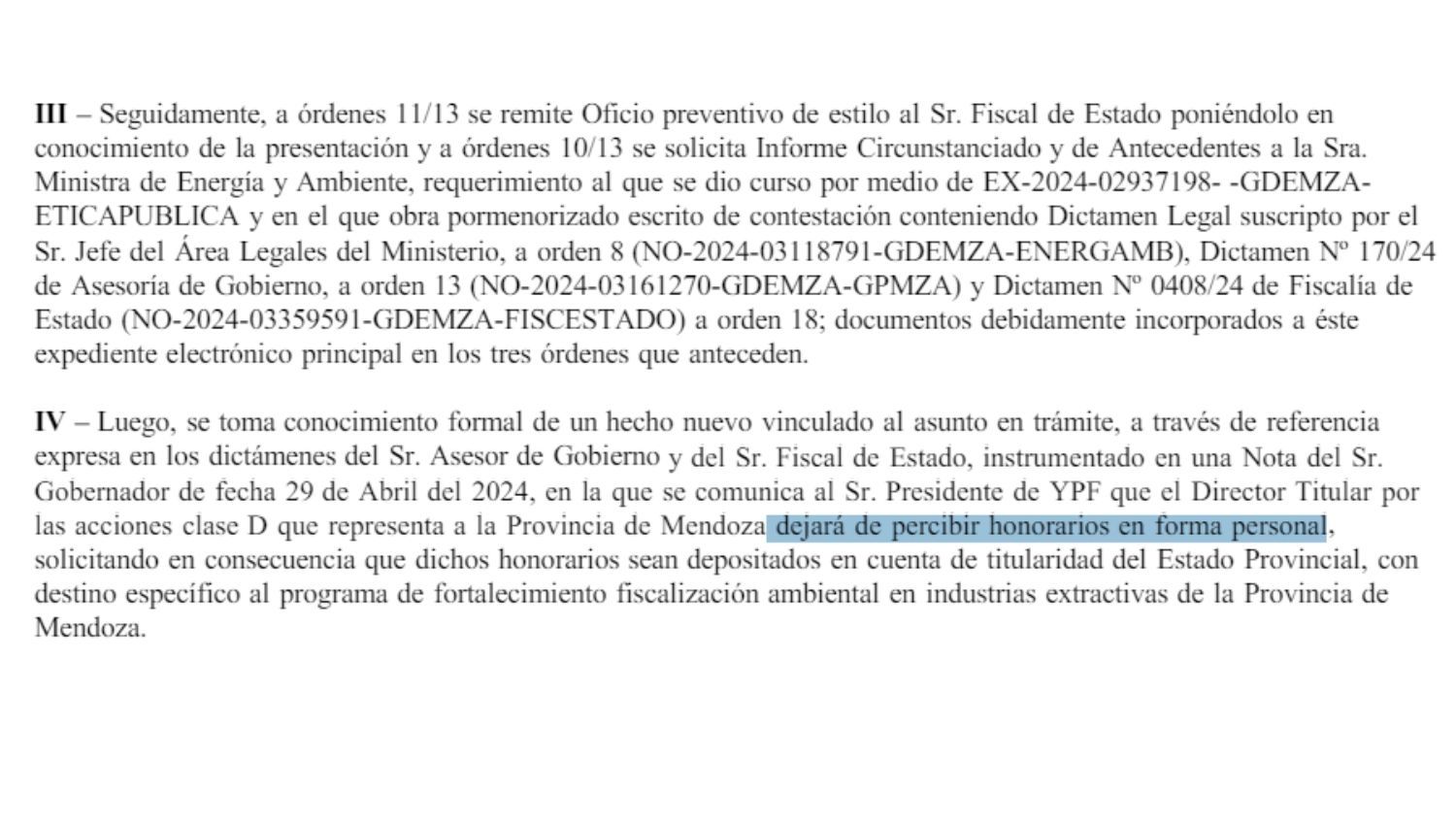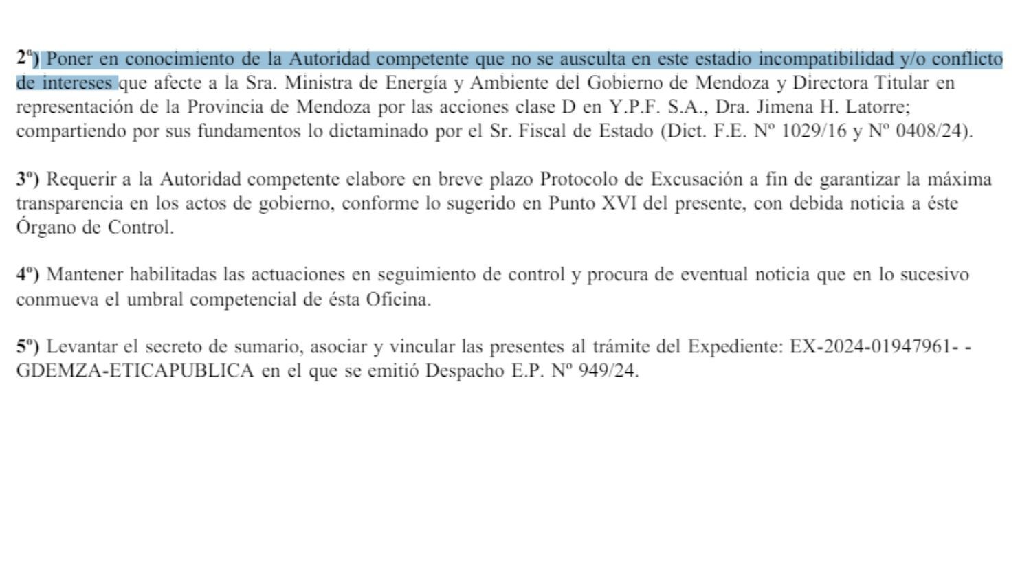 Otro punto que jugó a favor de Jimena Latorre, fue la decisión del gobernador Alfredo Cornejo de solicitar que la ministra ya no cobre más el sueldo como directora de YPF. De hecho este tema se encuentra resaltado como un antecedente en el dictamen. “La Nota del sr. Gobernador de fecha 29 de Abril del 2024, en la que se comunica al Sr. Presidente de YPF que el Director Titular por las acciones clase D que representa a la Provincia de Mendoza dejará de percibir honorarios en forma personal, solicitando en consecuencia que dichos honorarios sean depositados en cuenta de titularidad del Estado Provincial, con destino específico al programa de fortalecimiento fiscalización ambiental en industrias extractivas de la Provincia de Mendoza”, marca el dictamen.