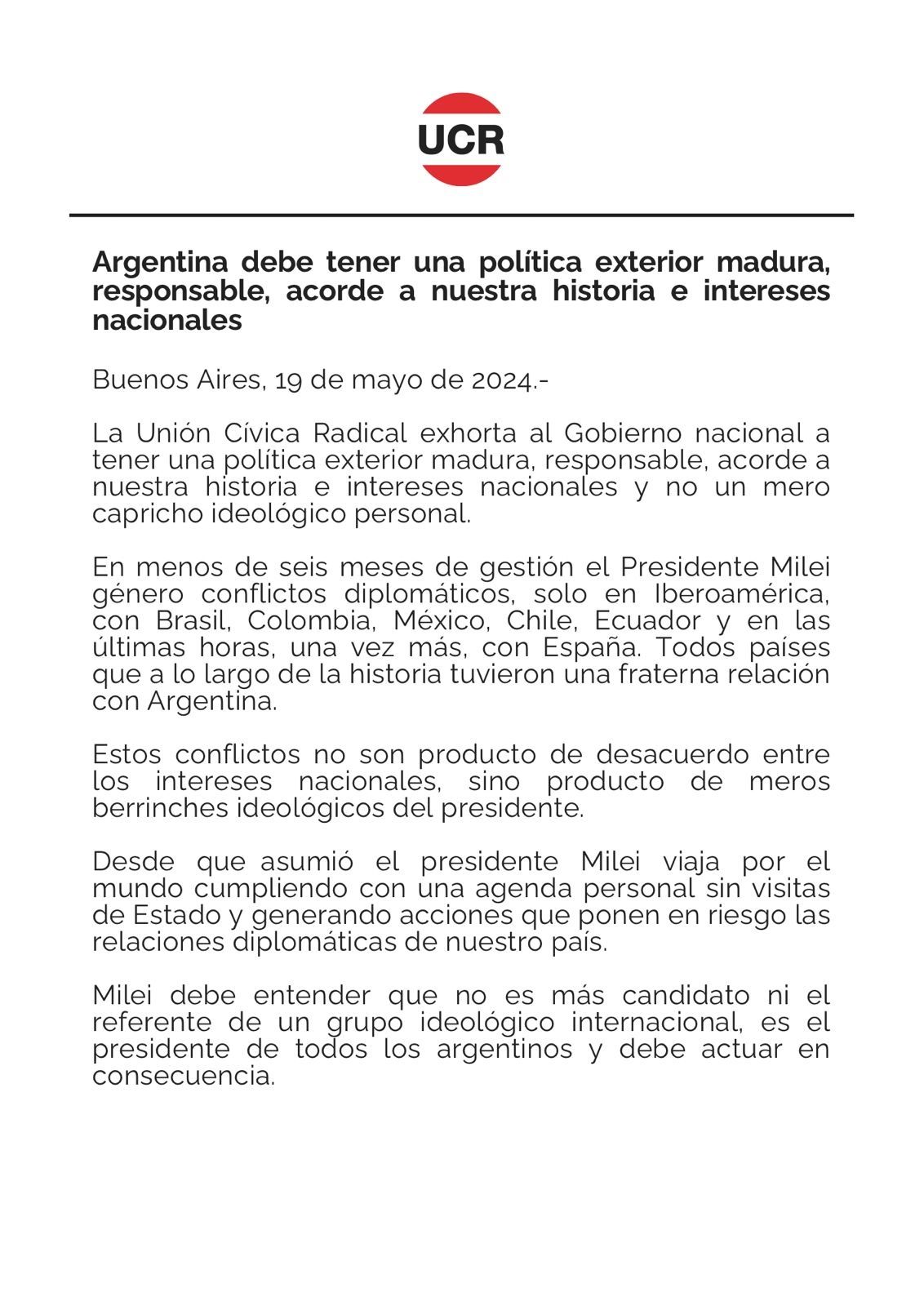 Bajo el título "Argentina debe tener una política exterior madura, responsable, acorde a nuestra historia e intereses nacionales", la UCR exhortó al Gobierno a tener "una política exterior madura, responsable, acorde a nuestra historia e intereses nacionales y no un mero capricho ideológico personal".