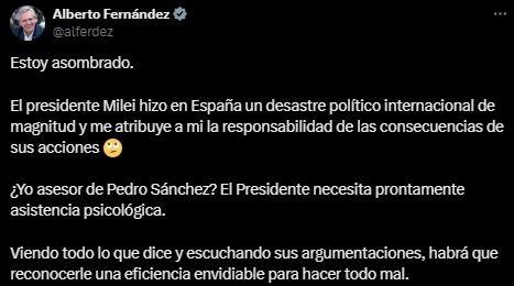 "Estoy asombrado. El presidente Milei hizo en España un desastre político internacional de magnitud y me atribuye a mí la responsabilidad de las consecuencias de sus acciones", escribió en la red social X.
