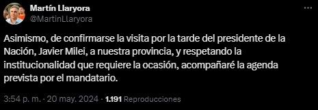 "Asimismo, de confirmarse la visita por la tarde del presidente de la Nación, Javier Milei, a nuestra provincia, y respetando la institucionalidad que requiere la ocasión, acompañaré la agenda prevista por el mandatario", agregó en su cuenta de X.