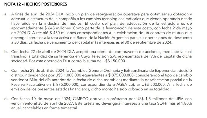El cambio implicó una ingeniería compleja. Según la comunicación oficial del Grupo Clarín, la adecuación de la estructura, es decir los despidos y demás acciones, tuvieron un costo de más de 600 millones de pesos. “A fines de abril de 2024 DLA inicio un plan de reorganización operativa para optimizar su dotación y adecuar la estructura… El costo del plan de adecuación de la estructura es de aproximadamente $ 645 millones”, informaron. “Con fecha 26 de marzo de 2024, la Sociedad, Cimeco y DLA celebraron un convenio de aportes irrevocables destinado a la absorción de pérdidas, mediante el cual la Sociedad y CIMECO aportaron en DLA la suma de $16.449.980 y $65.799.920, respectivamente”, agrega el balance de Clarín.