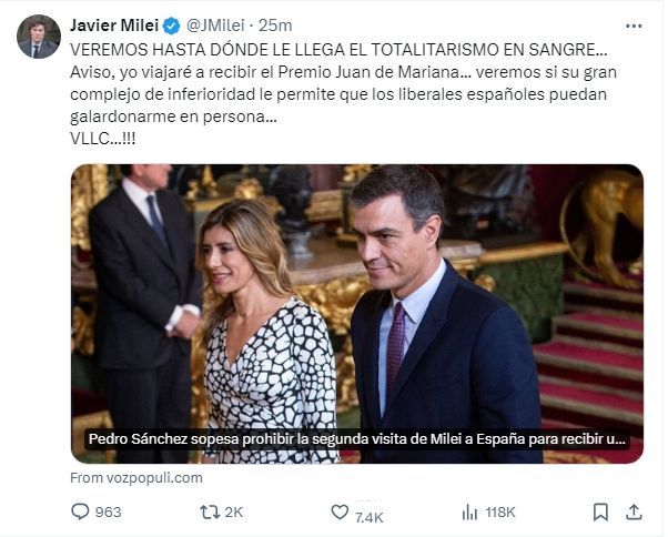 "VEREMOS HASTA DÓNDE LE LLEGA EL TOTALITARISMO EN SANGRE... Aviso, yo viajaré a recibir el Premio Juan de Mariana... veremos si su gran complejo de inferioridad le permite que los liberales españoles puedan galardonarme en persona...", fue el posteo de Javier Milei con la confirmación.
