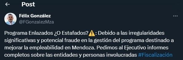 “Programa Enlazados ¿O Estafados? Debido a las irregularidades significativas y potencial fraude en la gestión del programa destinado a mejorar la empleabilidad en Mendoza. Pedimos al Ejecutivo informes completos sobre las entidades y personas involucradas”, escribió el senador peronista Félix González junto a una captura del pedido de información en su cuenta oficial de X.