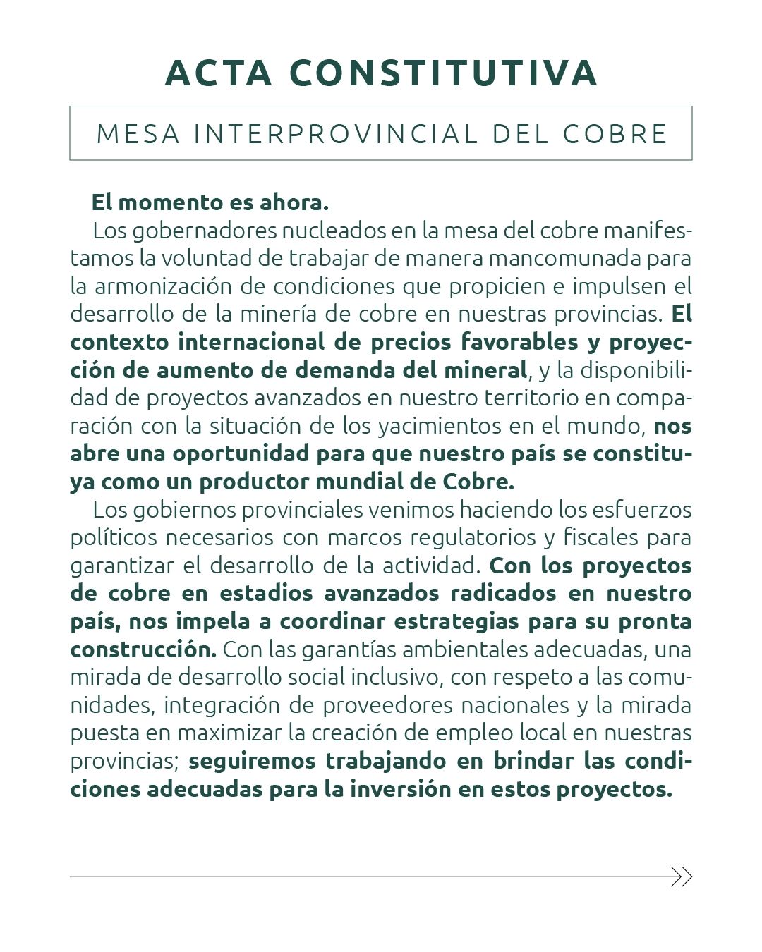Los gobernadores insisten. "Los gobiernos provinciales venimos haciendo los esfuerzos políticos necesarios con marcos regulatorios y fiscales para garantizar el desarrollo de la actividad. Con los proyectos de cobre en estadios avanzados radicados en nuestro país, nos impela a coordinar estrategias para su pronta construcción.