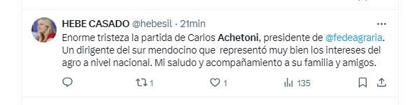 También lo hizo la vicegobernadora de Mendoza, Hebe Casado, recordando que Achetoni nació en el sur de la provincia de Mendoza. "Enorme tristeza la partida de Carlos Achetoni, presidente de la Federación Agraria Argentina (FAA). Un dirigente del sur mendocino que representó muy bien los intereses del agro a nivel nacional. Mi saludo y acompañamiento a su familia y amigos", señaló.