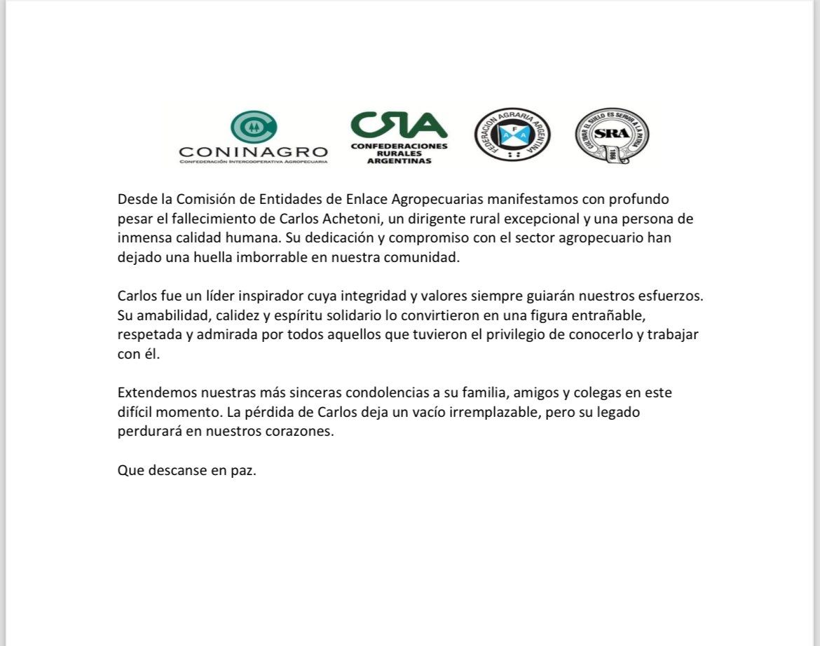 A través de un comunicado, las organizaciones que integran la Mesa de Enlace se hicieron eco de la noticia y despidieron al dirigente mendocino: "Desde la Comisión de Entidades de Enlace Agropecuarias manifestamos con profundo pesar el fallecimiento de Carlos Achetoni, un dirigente rural excepcional y una persona de inmensa calidad humana. Su dedicación y compromiso con el sector agropecuario han dejado una huella imborrable en nuestra comunidad".