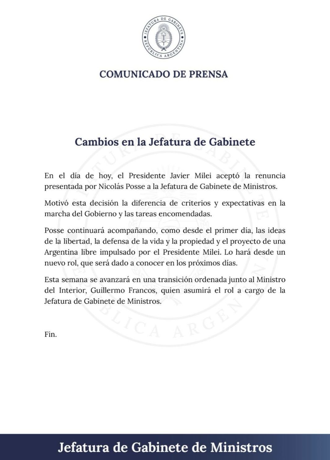 Desde el lado de Posse, sin embargo, el mensaje de despedida fue mucho más crudo. "Motivó esta decisión la diferencia de criterios y expectativas en la marcha del Gobierno y las tareas encomendadas", dice el texto de prensa de la Jefatura de Gabinete. Y aclara que seguirá "acompañando", pero "desde un nuevo rol que será dado a conocer en los próximos días". Cierra con un mensaje irónico que parece apuntar a Manuel Adorni y su jefa, Karina Milei: "Fin", como termina todos los tuits el portavoz de la Presidencia.