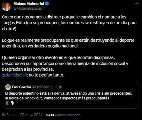 Recalcó que el objetivo del Gobierno es "organizar otro evento en el que recortan disciplinas, desconocen su importancia como herramienta de inclusión social y desprecian a las provincias". Finalmente, Galmarini mencionó al funcionario y le dedicó una chicana. "Daniel Scioli: no te pedían tanto".