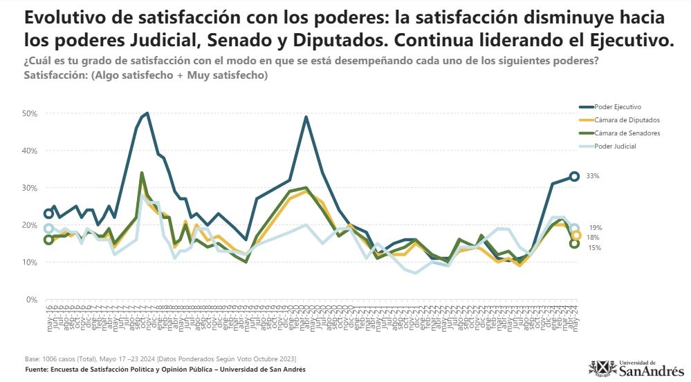 Otro aspecto en consideración es que, si se tiene en cuenta la evolución de la satisfacción a lo largo del tiempo, el Poder Ejecutivo es el único que mantiene una tendencia alcista.