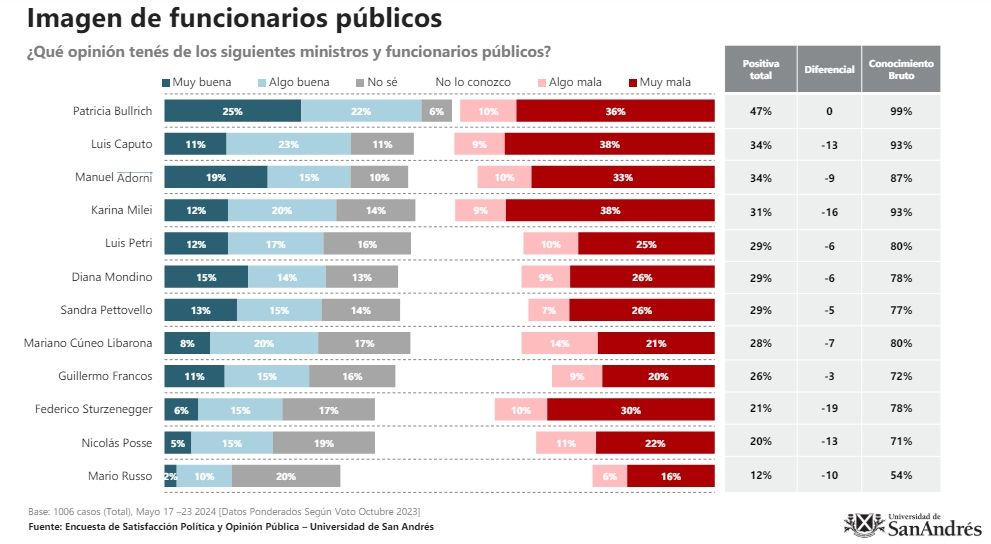 Por otro lado, el top 3 del ránking de funcionarios del Gabinete de Javier Milei ubica a la ministra de Seguridad, Patricia Bullrich, con 47% de valoración positiva. Después, aparecen empatados con 34% el vocero presidencial, Manuel Adorni, y el ministro de Economía, Luis "Toto" Caputo.