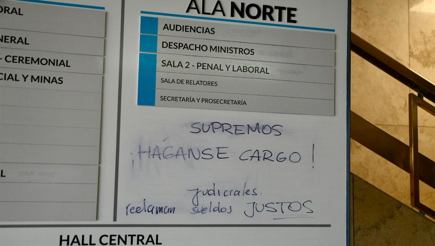 La Corte anunció que descontará los días de paro como medida coercitiva, en consonancia con el aumento por Decreto que decidió el Gobierno. Los efectos de esa decisión no se sentirán de inmediato, pues en el sueldo que los estatales cobrarán el viernes solo se descontará un día: el 30 de abril, día en que se inició la medida de fuerza. En mayo, Tribunales estuvo casi parado y son más de 15 los días de paro a descontar. El impacto en algunos trabajadores puede ser muy relevante, pues quienes tienen baja antigüedad y un cargo de categoría inicial, cobran menos de 500 mil pesos. Un ayudante de fiscal con 20 años de antigüedad cobra 1,3 millones de pesos. Un empleado clase 20 (una de las más bajas) ronda los 600 mil pesos. Un psicólogo sin bloqueo de título cobra 800 mil pesos. Un auxiliar clase 13 que realiza trabajo de oficina percibe cerca de 500 mil pesos.