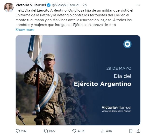En la misma línea, Victoria Villarruel cerró: "A todos los hombres y mujeres que integran el Ejército un abrazo de esta vicepresidente que les agradece el sacrificio diario. ¡Todo por Argentina!".