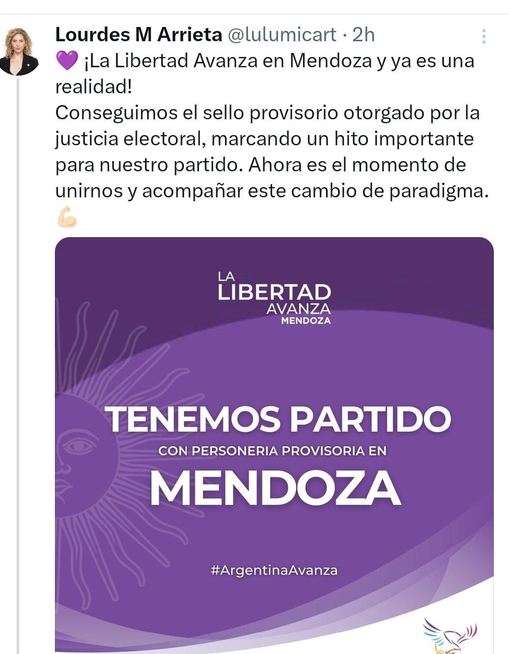 La diputada nacional Lourdes Arrieta logró lo que buscaba: tener el sello, provisorio por ahora, de la Libertad Avanza en Mendoza. Se trata del partido que impulsa la hermana del presidente, Karina Milei, para las elecciones legislativas del 2025. Sin embargo, debe afiliar a 4.000 personas para conseguir el sello definitivo y, en ese marco, veta a los dirigentes que quieran usar la denominación de su partido para armar bloques y apunta a que militantes de otras fuerzas políticas se sumen a su estructura. "Habrá fuga de la militancia de otros partidos hacia nuestro espacio", aseguran desde el nuevo partido en diálogo con MDZ.