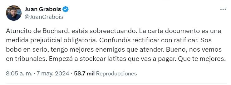 "Atuncito de Buchard, estás sobreactuando. La carta documento es una medida prejudicial obligatoria. Confundís rectificar con ratificar. Sos bobo en serio, tengo mejores enemigos que atender. Bueno, nos vemos en Tribunales. Empezá a stockear latitas que vas a pagar. Que te mejores", le escribió en la red social X esta mañana el dirigente social y exprecandidato a presidente por Unión por la Patria Juan Grabois al legislador porteño Ramiro Marra.