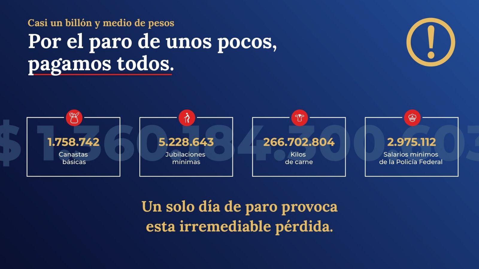 En el desglose, desde el Gobierno expresaron que con ese monto de dinero se podrían haber cubierto 1.758.742 canastas básicas; 5.228.643 jubilaciones mínimas; 266.702.804 kilos de carnes; y 2.975.112 salarios mínimos.
