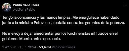 "Tengo la conciencia y las manos limpias. Me enorgullece haber dado junto a la ministra Pettovello la batalla contra los gerentes de la pobreza. No me voy a dejar amedrentar por los Kirchneristas infiltrados en el gobierno. Muerto antes que sucio", escribió.