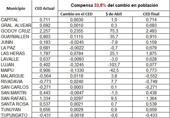 Ese último punto actualizado en la Legislatura, sustituye el Artículo 5 de la ley mencionada y crea el Coeficiente de Equilibrio del Desarrollo Municipal. La propuesta reemplaza el último término del nombre de este indicador e introduce modificaciones en la porción que recibe cada departamento en relación, directa y proporcional, al crecimiento demográfico. Hay municipios que se ven beneficiados -como Godoy Cruz y Guaymallén- y otros que no, como sucede en los casos de Maipú y Luján de Cuyo.