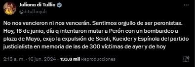 "Hoy, 16 de junio, día en que intentaron matar a (Juan Domingo) Perón con un bombardeo a Plaza de Mayo, exijo la expulsión de Scioli, Kueider y Espínola del Partido Justicialista en memoria de las de 300 víctimas de ayer y de hoy", escribió Di Tullio en la red social X.