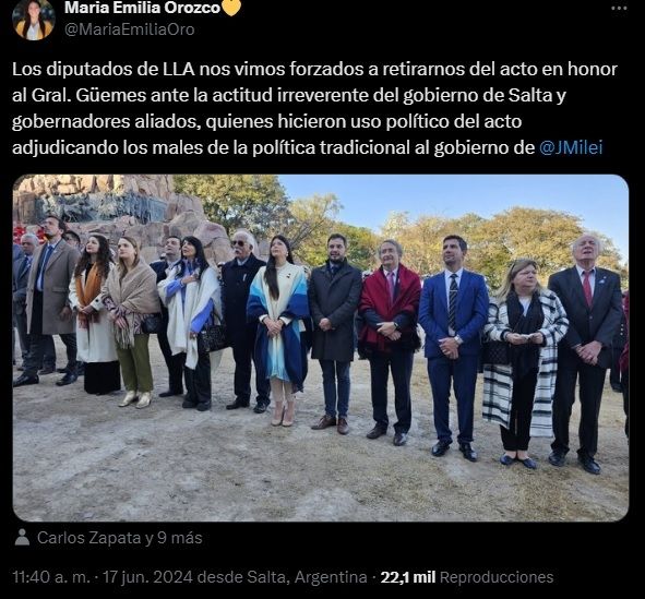La diputada nacional por Salta de La Libertad Avanza, María Emilia Orozco, repudió lo sucedido en redes sociales y expresó: "Los diputados de LLA nos vimos forzados a retirarnos del acto en honor al Gral. Güemes ante la actitud irreverente del gobierno de Salta y gobernadores aliados, quienes hicieron uso político del acto adjudicando los males de la política tradicional al gobierno de Javier Milei".