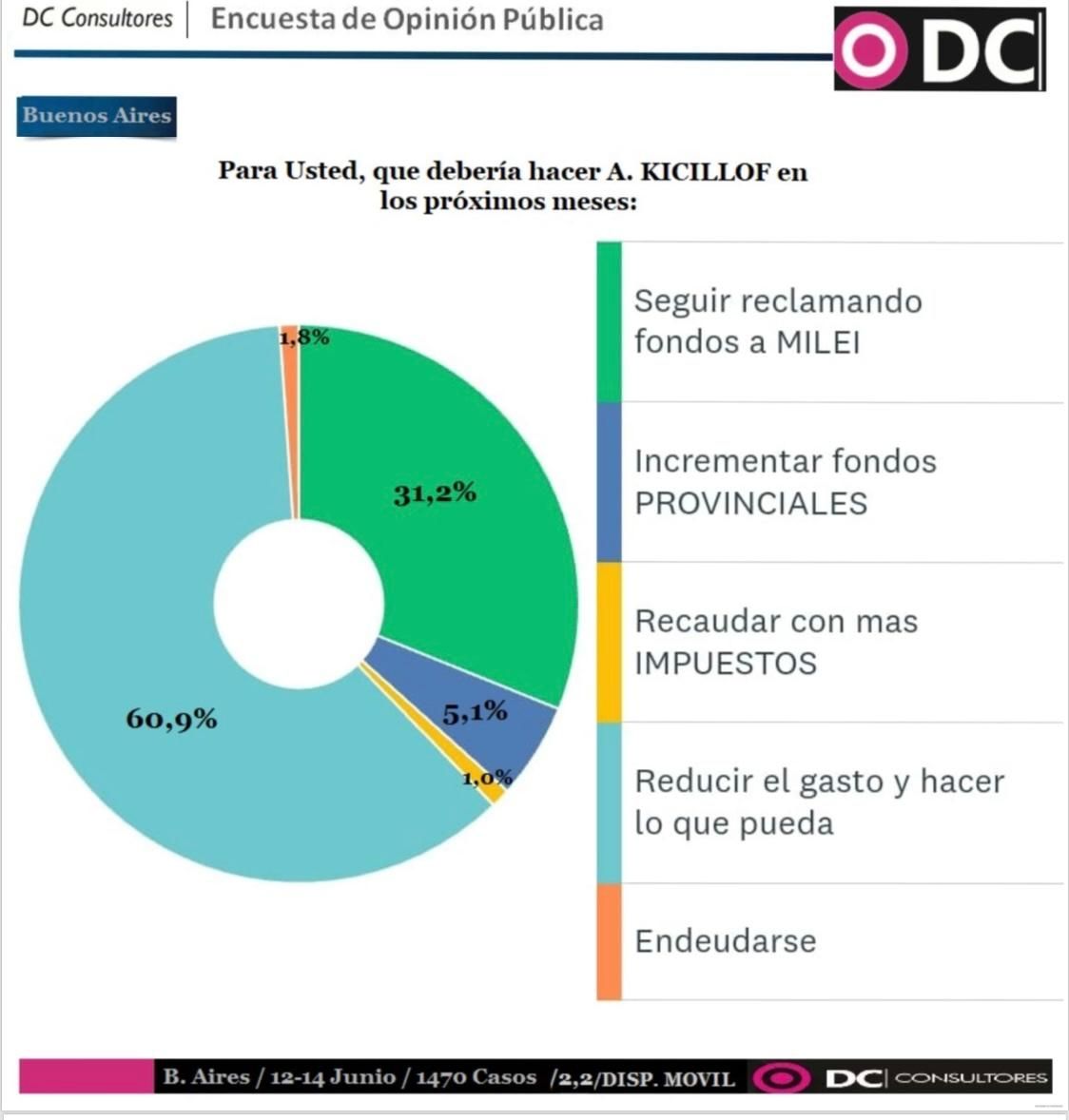 En cuanto a lo que debería hacer el gobernador con los recursos en los próximos meses, más del 60% de los encuestados consideró que se debe bajar el gasto público. En tanto, un poco menos del 40% cree que Kicillof debe seguir reclamando fondos al Gobierno nacional, aumentar impuestos a los bonaerenses o endeudarse.