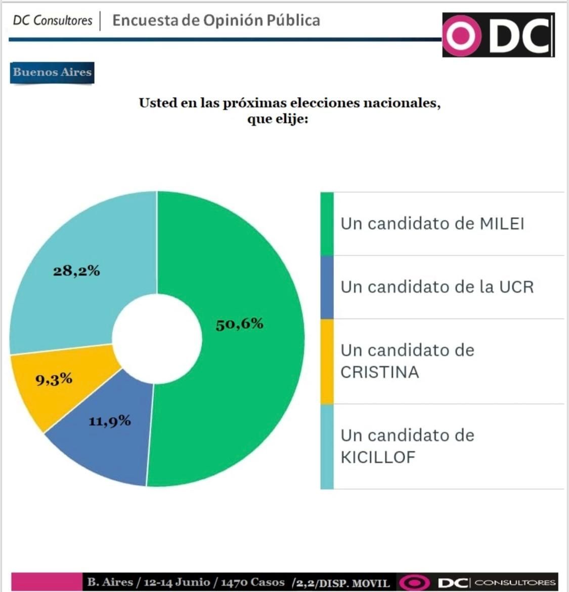 El 50,6% de los encuestados expresó su intención de votar por "un candidato de Milei" en las próximas elecciones nacionales. En contraste, un 28,2% se inclinaría por "un candidato de Kicillof", el 11,9% por "un candidato de la UCR" y el 9,3% por "un candidato de Cristina".