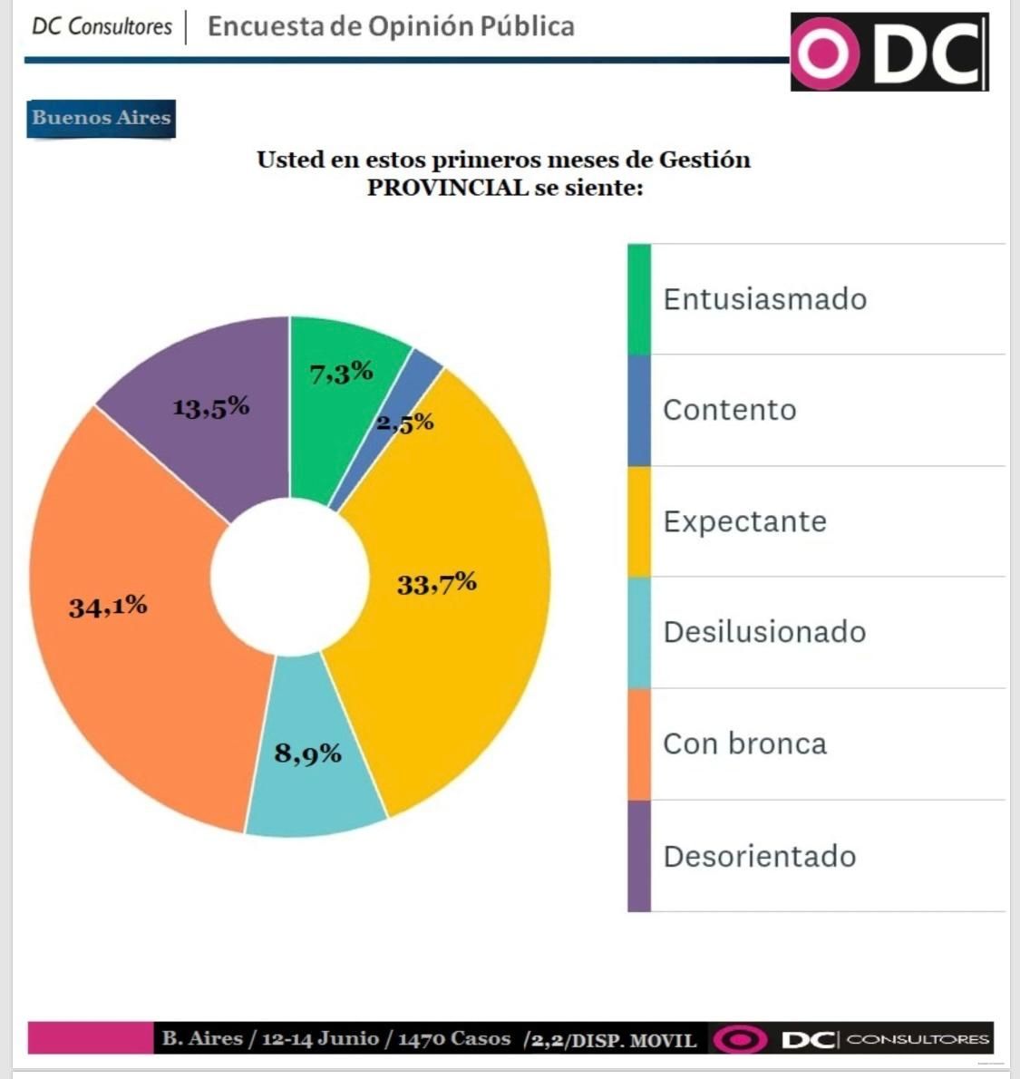 Sobre la evaluación de los primeros meses del segundo mandato de Axel Kicillof, los números del sondeo de DC Consultores son contundentes. Menos del 10% de los encuestados están entusiasmados y contentos con el segundo mandato del gobernador, y el 33,7% está expectante. Lo que arroja que menos de la mitad de los bonaerenses aprueba el rumbo de los siete primeros meses de la segunda parte de Kicillof al frente de la provincia de Buenos Aires.