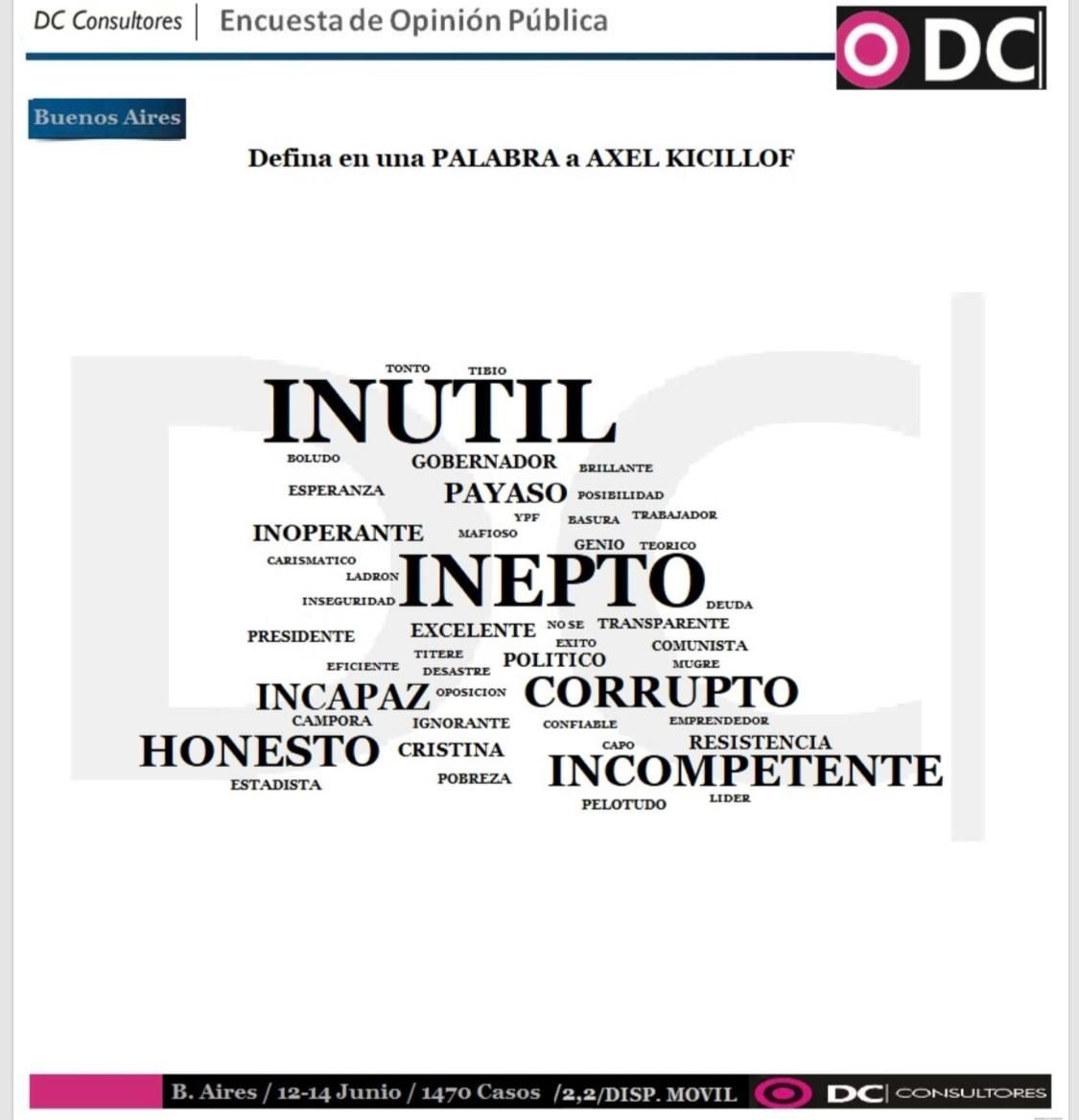 A Kicillof tampoco le va bien en la nube de palabras, con la cual se define a un político o personaje que se esta midiendo en la encuesta de imagen. En este punto, Aníbal Uríos afirmó: "La percepción que tiene la gente sobre el gobernador no cambió con respecto al sondeo que habíamos hecho previo a la elección que le permitió a Kicillof retener la provincia. Gran parte del electorado lo sigue viendo como 'un inútil y un inepto' y mientras no haya una oposición unida, algo que no paso en el 2023, el peronismo va a seguir gobernado la provincia de Buenos Aires".