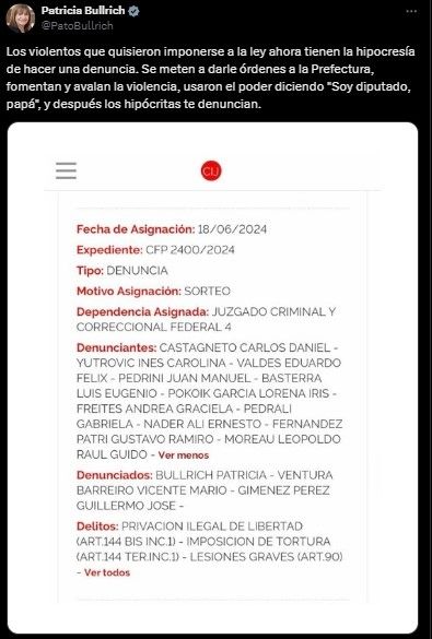 A través de las redes sociales, la funcionaria redobló la apuesta y utilizó una frase irónica para apuntar contra los integrantes de Unión por la Patria: "Soy diputado, papá". Según Bullrich, esta fue la expresión que utilizaron para darles "órdenes a la Prefectura, fomentar y avalar la violencia".