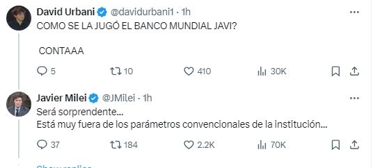 Uno de los temas del día hasta el momento de la interacción de Javier Milei con sus seguidores fue el posible desembolso que realizaría el Banco Mundial durante 2025. Se dice que serán cerca de 2.000 millones de dólares que estarían destinados a asistencia social. El dato que podría confirmarlo es que el propio presidente estuvo junto al presidente de la entidad crediticia, Ajay Banga en la Cumbre del G7 en Bari, Italia.