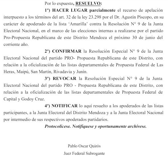 El titular del Juzgado Federal N° 1 de Mendoza, Pablo Quirós, dictó un fallo este jueves 20 de junio en el que hizo lugar parcialmente a una apelación de la lista Amarilla y revocó la oficialización de las listas departamentales del espacio Propuesta Federal en los departamentos de Capital y Godoy Cruz. A su vez, confirmó la oficialización de las listas departamentales del sector en Las Heras, Maipú, San Martín, Rivadavia y Junín.