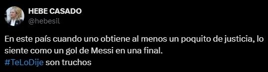 Esta resolución fue celebrada por la vicegobernadora Casado en las redes sociales, quien a primera hora de la mañana publicó: “En este país cuando uno obtiene al menos un poquito de justicia, lo siente como un gol de Messi en una final. #TeLoDije son truchos”.