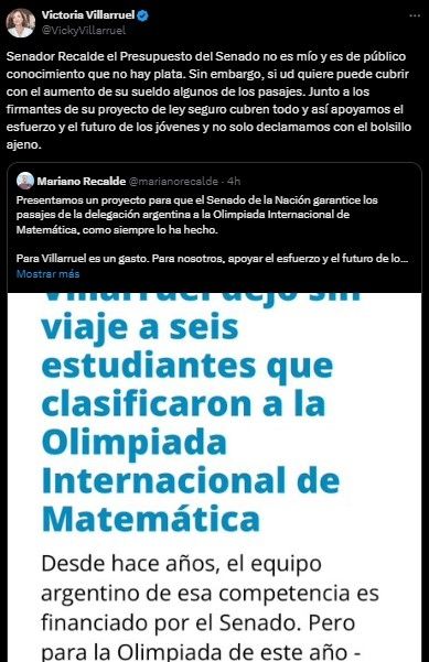 La vicepresidente de la Nación, Victoria Villarruel, protagonizó un nuevo cruce en redes sociales. Fue tras un mensaje del senador nacional, Mariano Recalde, a raíz de un pedido que hizo en redes sociales que involucraba el viaje a estudiantes a las Olimpiadas de Matemáticas.