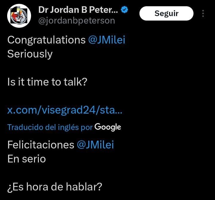 "Enhorabuena, Javier Milei. En serio, ¿es hora de que hablemos?", escribió Jordan Peterson dirigiéndose al mandatario argentino.