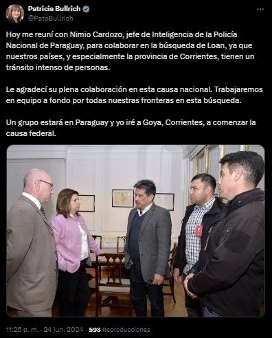 En un mensaje por la red social X, Bullrich le agradeció a Cardoso por "su plena colaboración en esta causa nacional". "Trabajaremos en equipo a fondo por todas nuestras fronteras en esta búsqueda", señaló.