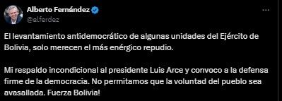 "El levantamiento antidemocrático de algunas unidades del Ejército de Bolivia, solo merecen el más enérgico repudio. Mi respaldo incondicional al presidente Luis Arce y convoco a la defensa firme de la democracia. No permitamos que la voluntad del pueblo sea avasallada. Fuerza Bolivia!", escribió Alberto Fernández en su cuenta de X.