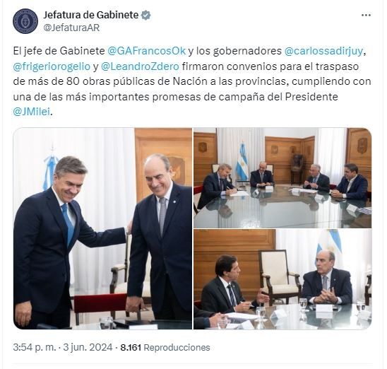 De a poco, comienza a abrirse el grifo y los gobernadores respiran aliviados. Si bien ese dinero no soluciona sus urgencias, sirve para reactivar obras necesarias y poner en funcionamiento un sector que estaba paralizado. Ayer, el gobernador de Entre Ríos Rogelio Frigerio se reunió con el jefe de Gabinete, Guillermo Francos, para firmar el traspaso de la obra pública de Nación a la provincia. También hizo lo propio el gobernador de Chaco, Leandro Zdero y su par de Jujuy, Carlos Sadir.