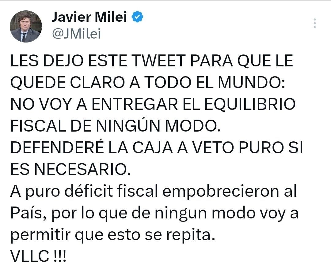 “Les dejo este tweet para que le quede claro a todo el mundo: no voy a entregar el equilibrio fiscal de ningún modo. Defenderé la caja a veto puro si es necesario. A puro déficit fiscal empobrecieron al país, por lo que de ningún modo voy a permitir que esto se repita. VLLC !!!”, expresó el presidente este miércoles en horas de la madrugada.