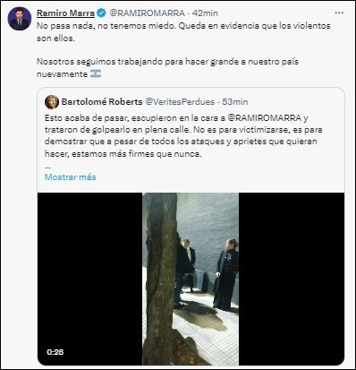“No pasa nada, no tenemos miedo. Queda en evidencia que los violentos son ellos. Nosotros seguimos trabajando para hacer grande a nuestro país nuevamente”, señaló Marra en su cuenta de X.