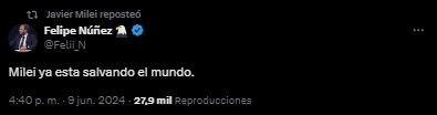 El presidente replicó un posteo de uno de sus usuarios favoritos, Felipe Núñez, que destacó que el líder de La Libertad Avanza está "salvando al mundo". "Espectacular timing de Milei para ir al G7, son las fuerzas del cielo", manifestó ese usuario y, a la vez, el presidente.