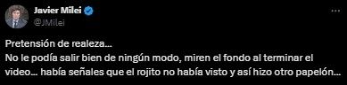 Milei aprovechó y disparó: "Pretensión de realeza. No le podía salir bien de ningún modo, miren el fondo al terminar el video. Había señales que el rojito no había visto y así hizo otro papelón".